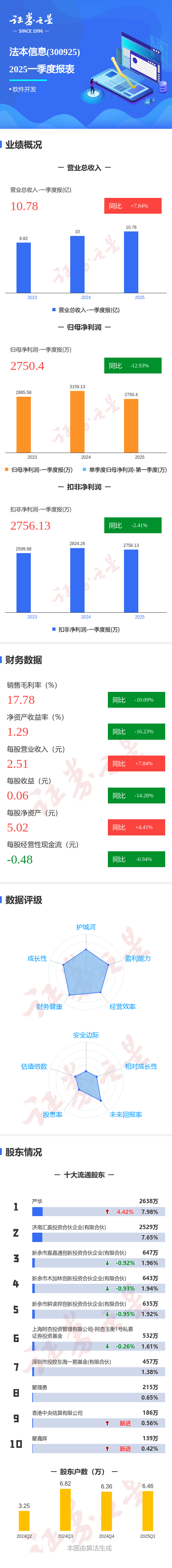 证券之星消息,法本信息2025年一季报显示,公司主营收入10.79亿元,同比上升7.85%;归母净利润2750.4万元,同比下降12.94%;扣非净利润2756.14万元,同比下降2.41%;负债率23.58%,投资收益446.7万元,财务费用293.01万元,毛利率17.78%。