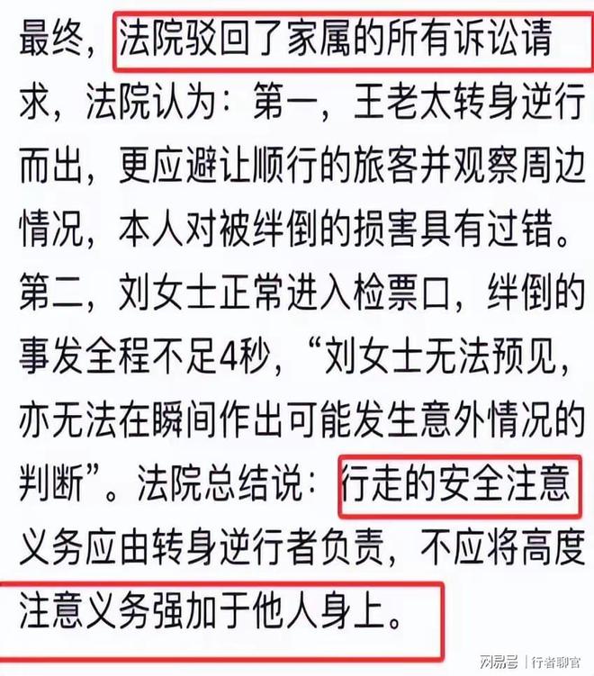 面对汹涌舆情,官方媒体也迅速发声,质疑“走路该保持‘安全距离’吗” ,并列举2019年北京车站的相似案例。当时,67岁的王老太与排队检票的刘女士相撞,被行李箱绊倒后脑出血去世,王家人索赔62万,法院却驳回诉求,明确行走的安全注意义务应由转身逆行者负责,不应强加于他人。